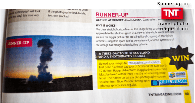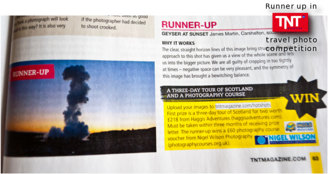 Not long ago one of my photos (see it here) came runner up in TNT Magazine’s weekly travel photography competition. This encouraged me to send in a few more, from this blog as well as a few from Iceland. A couple of months later, my persistance was rewarded with another runners up position! The winning photo is from Iceland- a Geyser engulfing an onlooking crowd, silhouetted against a perpetually orange winter sky.